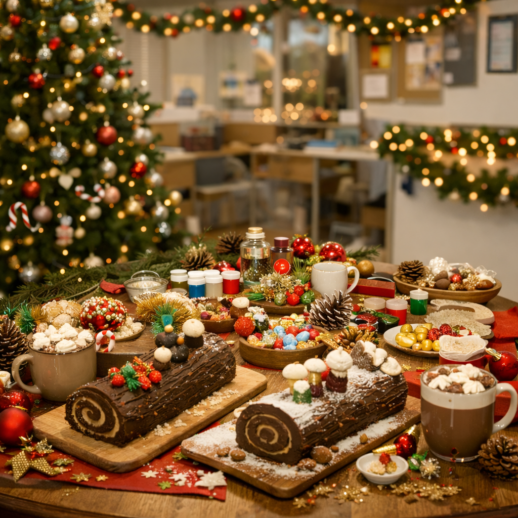 Atelier décoration de Noël, bûches de Noël, chocolat chaud et autres gourmandises vous attendent.