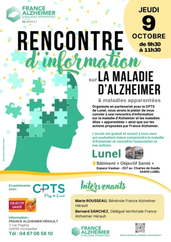 Organisée en partenariat avec la CPTS de Lunel, nous avons le plaisir de vous convier à une rencontre d’information sur la maladie d’Alzheimer et les maladies dites « apparentées » ainsi que sur les actions proposées par France Alzheimer.
